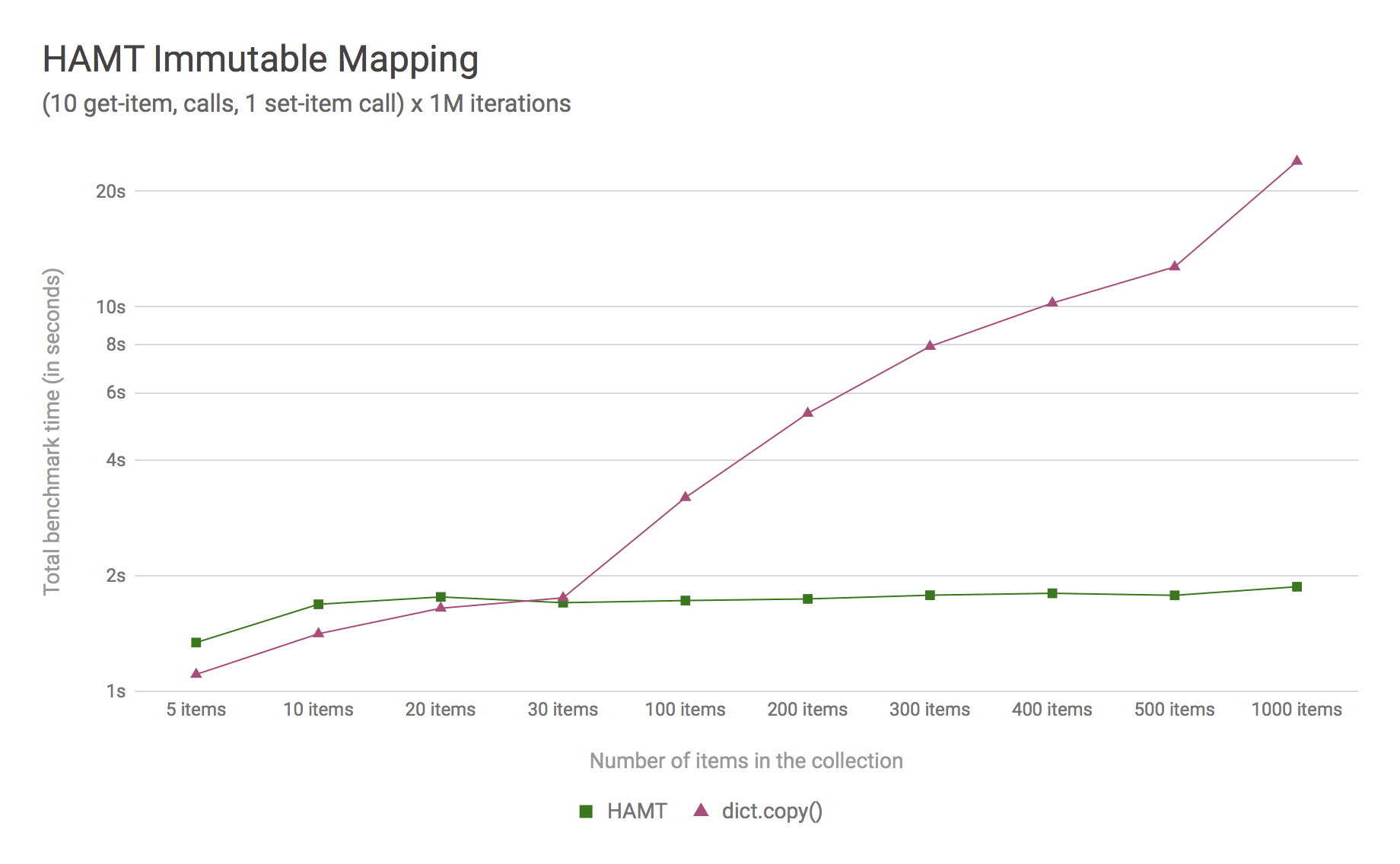 - HAMT displays near O(1) performance for all benchmarked dictionary sizes.